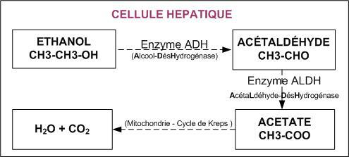 La première transforme l’éthanol en acétaldéhyde, composé encore plus toxique que l’éthanol lui-même (2).